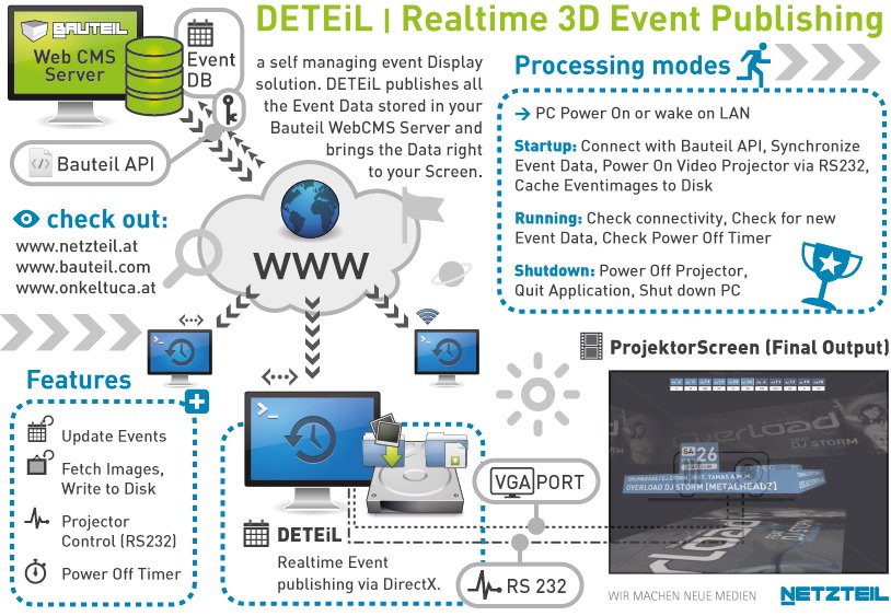 DETEiL ist eine 3D Visualisierungsschnittstelle mit deren Hilfe in Bauteil WebCMS hinterlegte Event und Veranstaltungsdaten autonom angezeigt werden.