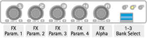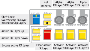 FX Layer Control In addition to its three Clip Layers, Resolume offers also three Layers for effects. If the indicator is illuminated the same section gives you quick access to the FX Layer control functions. |